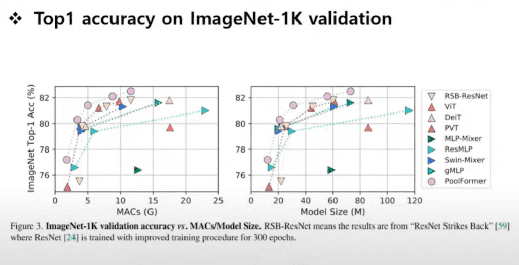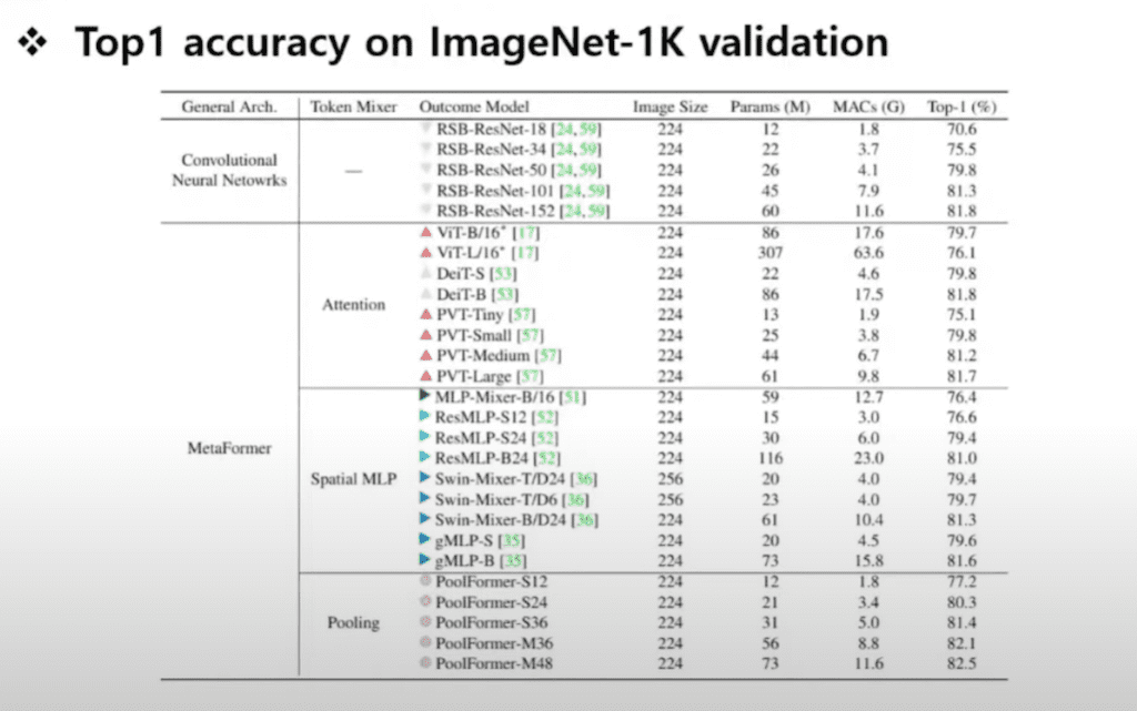 그리고 또 다른 모델의 어떤 MLP로 token mixing을 잘해서 성능을 올리는 대부분의 어떤 아키텍처들이랑 다 비교를 했고 성능이 우수하다는 것을 입증시키기 위해서 노력을 많이 했다고 보시면 될 거 같습니다.