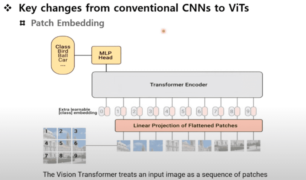 이런 부분들이 바뀌어서 이미지가 하나가 있으면 이 이미지를 잘게 조각을 낸 다음에 그 각각 잘게 조각을 낸 patch에서 특징을 추출하는 방식으로 shift화 되는 경향이 있다고 보시면 될 것 같습니다.