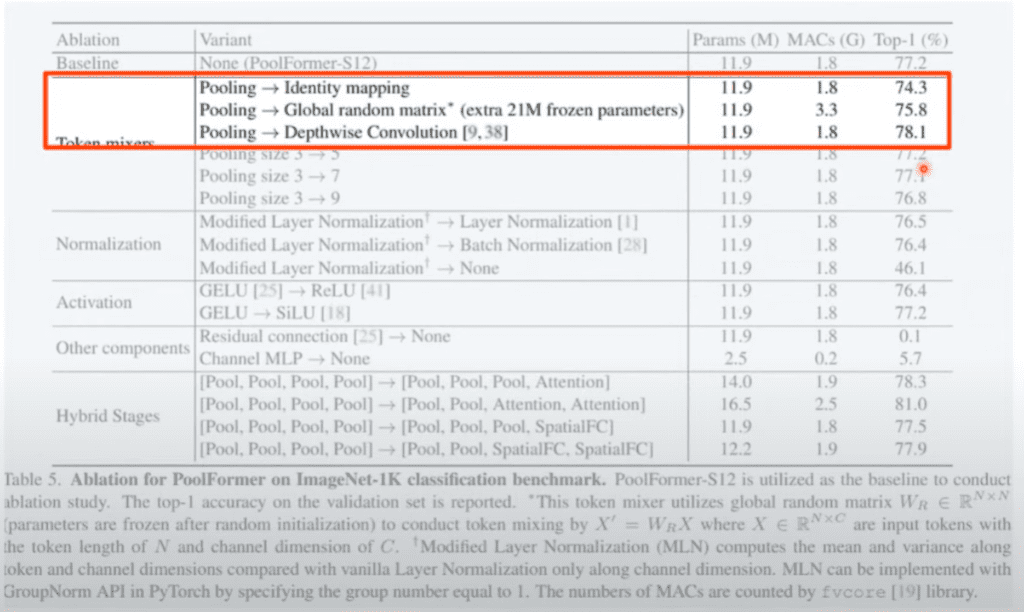 MetaFormer라는 구조 자체가 되게 훌륭한 구조라고 저자들은 믿는다라고 이렇게 실험적으로 보여줬고 여기에다가 랜덤 한 token mixing frozen 파라미터니까 따로 학습은 안 했는데 그렇게 하면 조금 성능은 올라갑니다. 앞에서 보셨던 것처럼 average Pooling 자체 사이즈가 3 x 3으로 가져갔기 때문에 사실 이게 non parametric convolution weight랑 bias가 없는 Convolution이랑 똑같다고 봐도 무방하기 때문에 weight를 주면 어떨까 생각을 해서 그런지 depth wise convolution을 썼는데 성능이 0.9% 올라가는 그런 결과를 관측했다고 설명하고 있습니다.