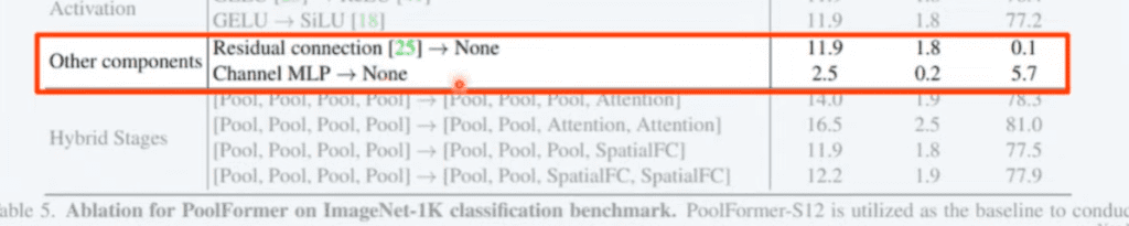 skip connection 부분은 아예 학습조차 안 되는 굉장히 중요한 부분이라고 얘기하고 있습니다. 그리고 채널 MLP 뒤쪽에 Multi Layer perceptron을 없앴을 때도 정확도가 5.7 정도로 아예 안 나오는 그런 수준으로 나왔다고 얘기하고 있습니다.