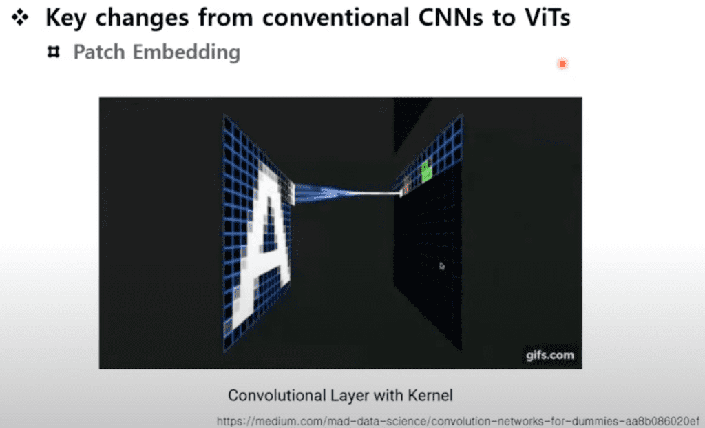 컴퓨터 비전에서는 요즘 트랜스포머를 이용한 아키텍처가 유행을 하고 트랜스포머로 넘어오면서 어떤 변화가 있었는지에 대해서 좀 살펴보면 일단 patch embedding이란 부분이 가장 클 것 같습니다. 슬라이딩 윈도우 방식으로 커널이 지나가면서 feature map을 생성하는 방식입니다.