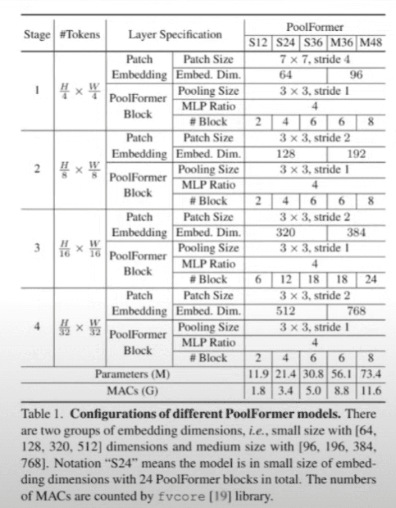 그리고 블록은 PoolFormer 블록 개수를 얘기합니다. 블록 개수는 가면 갈수록 커지는 형태를 전부 취하고 있고 mlp ratio은 각각의 스테이지별로 전부 다 똑같이 4로 고정된 것을 보실 수 있습니다. pooling 사이즈는 3 x 3으로 해서 전체 map을 1 stride 건너뛰지 않고 천천히 스캔하는 방식으로 구성이 되어 있고 patch embedding 자체는 아무래도 Input 이미지 자체가 크다 보니까 patch 사이즈를 조금 크게 가져간 다음에 뒤쪽에서는 3 x 3 정도면은 feature map에 꽤 큰 범위를 차지한다고 판단해서 그런지 3 x 3 정도에 사이즈로 뒤쪽에는 patch embedding을 하는 전략을 보실 수가 있습니다.