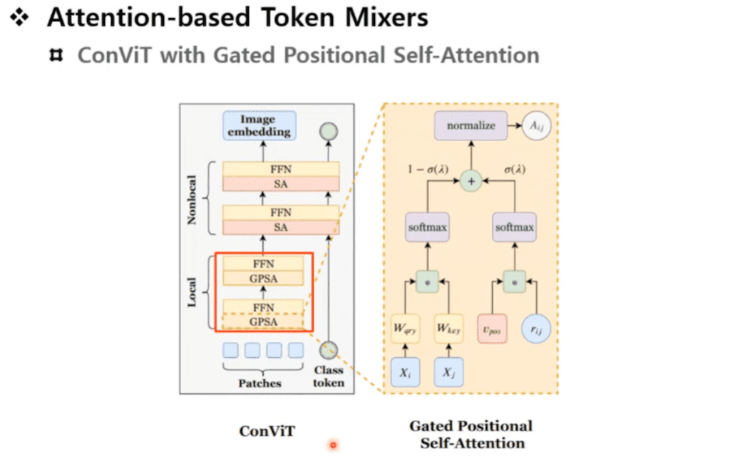 이렇게 attention이 굉장히 좋은 방식이다라고 사람들이 믿었기 때문에 그 후에 후속작들은 attention을 어떻게 하면 더 잘할까에 대해서 많이 고민을 했었습니다. 위 그림 보시면 GPSA라는 새로운 형태의 attention 방식을 제안을 했고 원래는 key, query가 들어가는데 key, query에다가 두 가지 정도 더 Input을 집어넣어서 attention 자체를 좀 강화하려는 시도들이 많이 있었습니다.