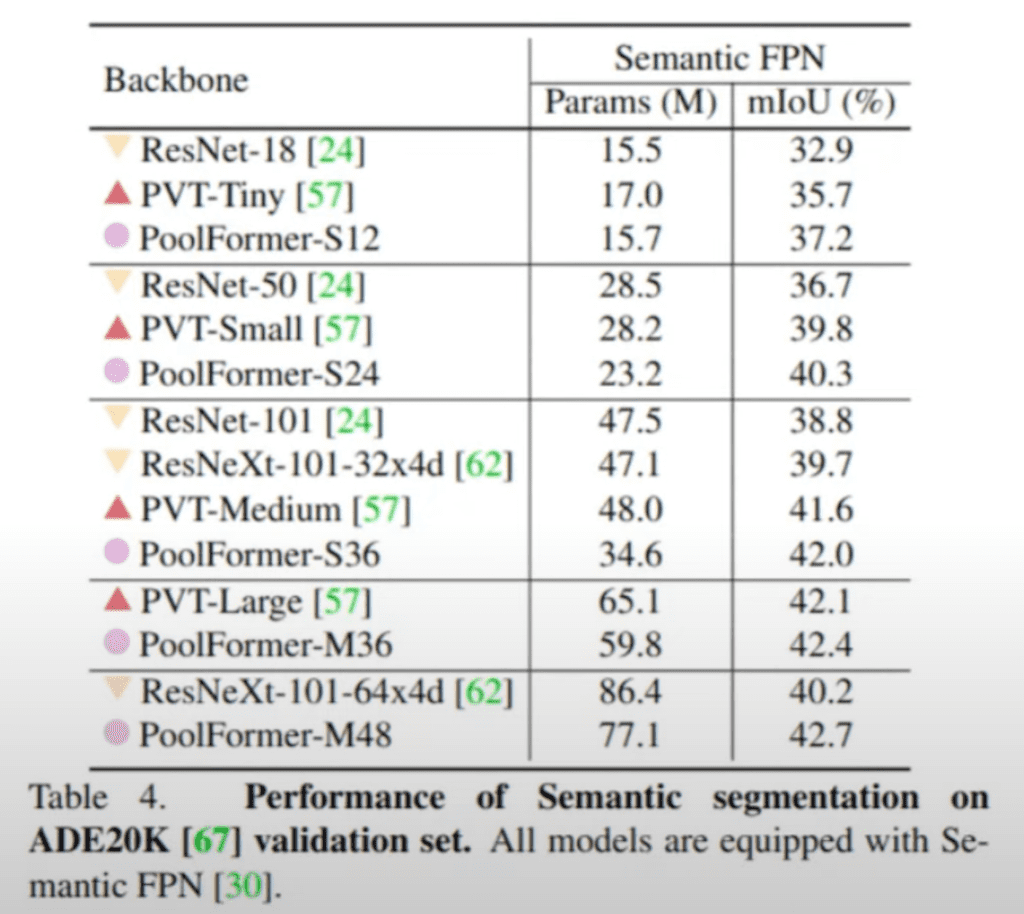 그리고 ADE20 K validation set에서도 PoolFormer 아키텍처를 이용해서 Segmentation을 수행을 했습니다. 그 모델 실험을 수행할 때 Semantic FPN이라는 Segmentation 아키텍처를 이용했다고 밝히고 있습니다.
