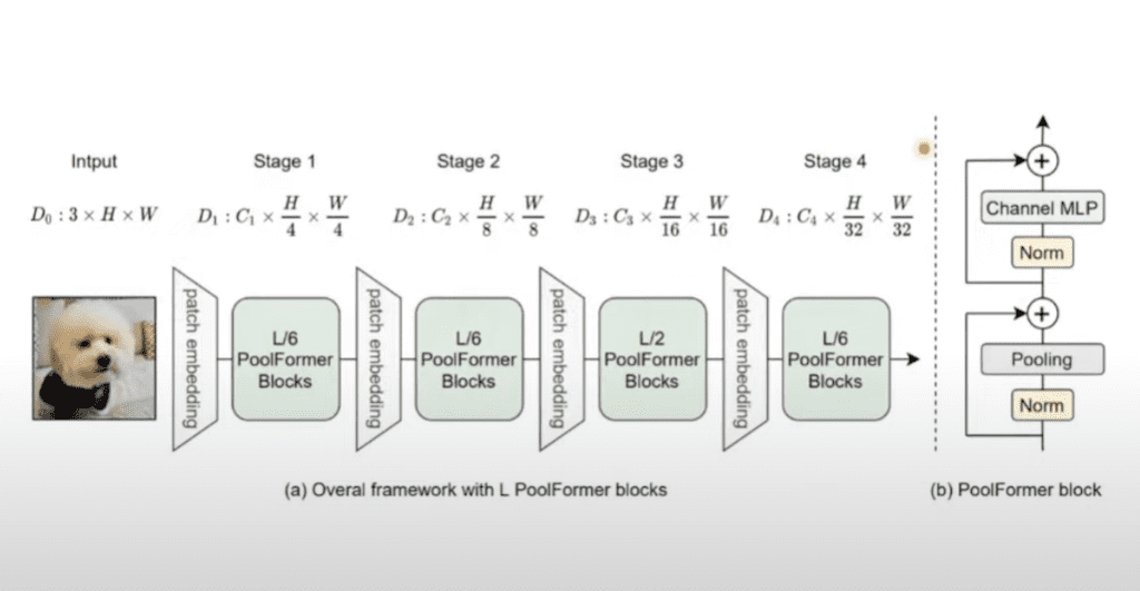 이 구조를 전체적으로 보면 patch embedding이 총 네 번 들어가게 됩니다. 각 patch embedding 사이에 PoolFormer들을 여러 개를 집어넣어서 특징을 추출하는 단계로 구성했습니다.
