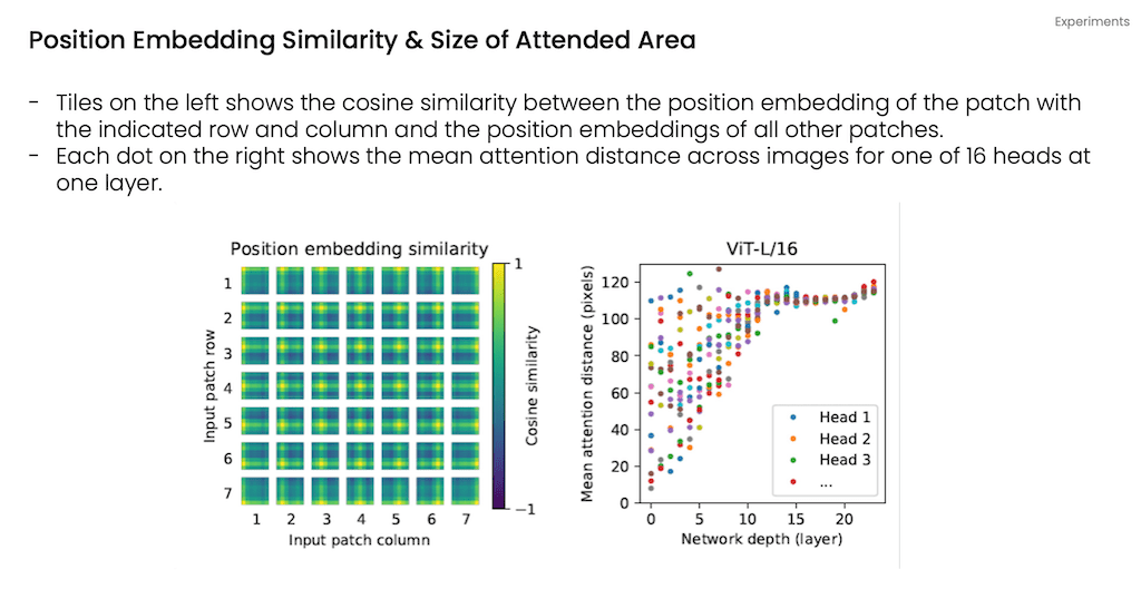 각 patch의 위치에 해당하는 position embedding을 다른 position embedding의 유사도를 구해봤을 때 가까운 위치일수록 유사도가 높은 경향을 나타난다는 것을 visualization 하였습니다.