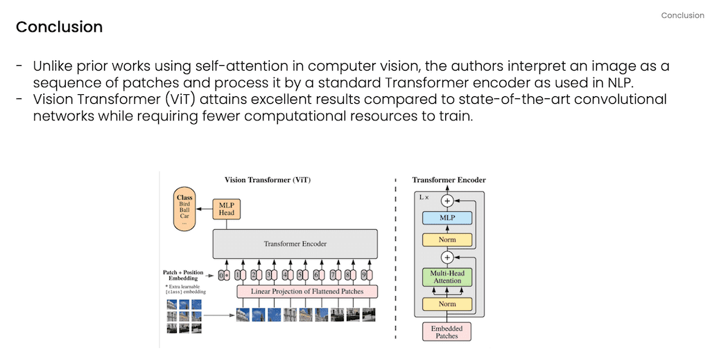 그리고 Transformer 기반에 더 좋은 성능의 모델들이 많이 나오고 있지만 그 시초가 되는 ViT를 공부하는 것은 다른 모델들을 이해하는데 많은 도움이 되었다는 개인적인 의견이 있습니다.