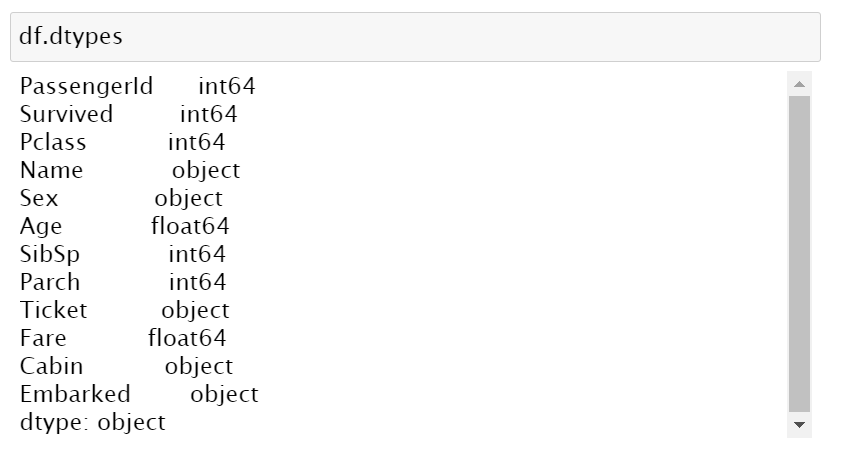 각 열의 데이터 타입을 출력하는 함수입니다. 전체 데이터 프레임 중 특정 칼럼에 있는 데이터들의 타입이 궁금할 때 사용합니다.