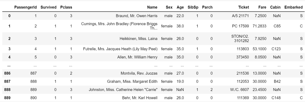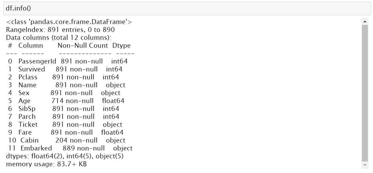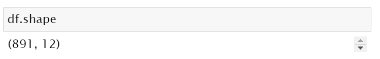 shape은 데이터의 (행, 열) 크기를 확인하고 DataFrame의 행과 열을 튜플 형태로 반환해 주는 함수입니다. 이 df는 891개의 행과 12개의 열을 가지고 있습니다.