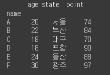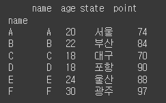 set_index()를 사용해 인덱스를 name으로 지정했습니다. 행번호 인덱스가 아닌 칼럼명(name)을 지정한 인덱스가 생성되었습니다.