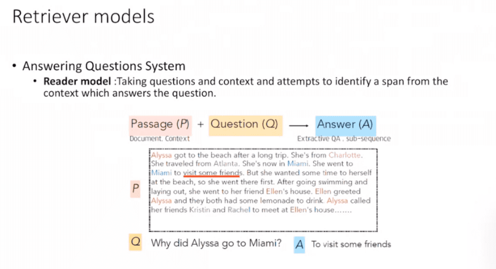 여기에 reader 모델입니다. 우리가 챗봇은 아주 훌륭한 챗봇을 쓴다고 하고 구글이나 인공지능 비서 많이 씁니다. 그런 시스템이 다 reader 모델까지 다 attach 되어 있어서 결과적으로는 Why did Alyssa go to Miami?으로 specific하게 질문을 던지면 해당 passage를 indexing해서 뽑은 다음에 질의에 의미와 기대되는 정답이 가장 유사한 span찾는거 까지 To visit some friends 으로 specific한 텍스트를 뽑는 과정까지 전체가 Q&A 시스템입니다. 그중에 Neural Ir 부분에 retrieval 모델 중간 단계 역할이라고 보시면 됩니다.