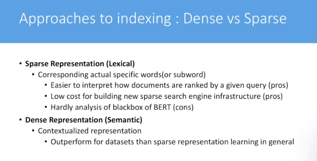 sparse search engine 이런 특정 도메인 단어에 특화된 search engine을 구축한다고하면 상당히 낮은 cost에서도 만들 수 있습니다. 왜냐면은 아무런 구분 없이 검색을 하게 되면 성능이 떨어지기 때문에 Sparse가 필요한 부분에선 되게 좋은 방법론중 하나입니다. 하지만 단점은 있습니다. 요즘 많이 쓰는 BERT를 활용한다고 하면은 블랙박스기 때문에 어떤 단어를 도출하고 이걸 어떻게 추론할 수 있는지 예상하기도 힘들고 예상한 결과에 대해서 분석하기 매우 어렵습니다. BERT는 이런 단점을 가지고 있습니다.