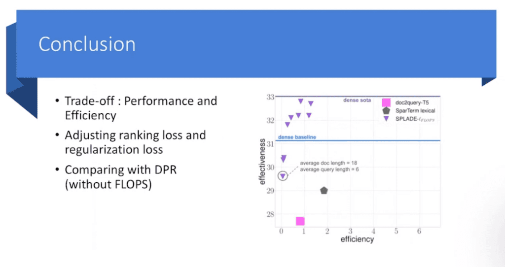 하나는 effectiveness 라고 해서 결과적으로 정확도입니다. x축은 efficiency라고 해서 논문에서는 FLOPS라고 하는데 FLOPS를 어떻게 계산하는지는 따로 설명하진 않았고 결국은 계산량이기 때문에 계산이 커지면 커질수록 물론 성능은 좋을 수 있지만 한 번 검색하는데 5, 10초씩 걸릴 수 없어서 결국 속도에 의해서 가장 trade off 관계를 갖고 있기 때문에 얼마나 FLOPS안에서 높은 성능을 낼 수 있느냐라고 했을 때는 SPLADE가 짧은 시간 안에 나름 좋은 성능을 얻은 것을 확인할 수 있습니다.