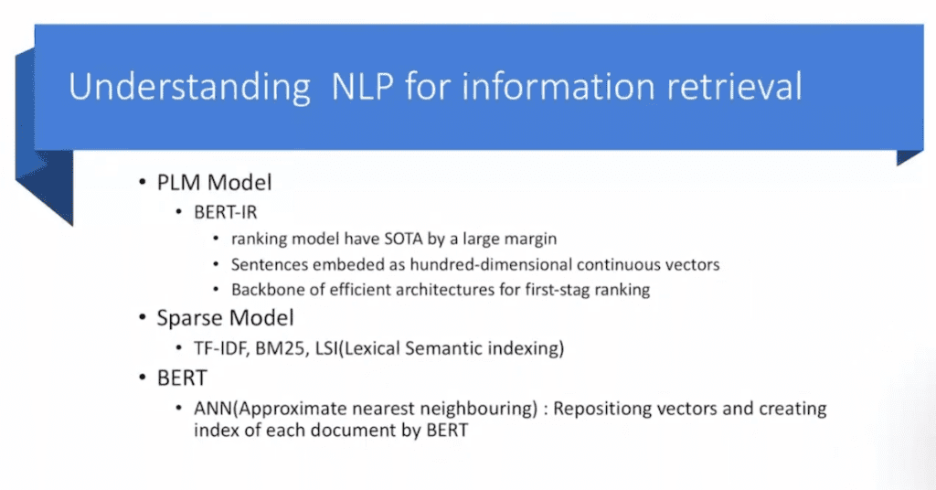 Sparse 모델은 TF-IDF, BM25, LSI 이런 전통적인 구조를 많이 활용 했습니다. BERT는 어떤 전체 맥락 흐름을 제어하고 그걸 가지고 학습한 모델이기 때문에 생각보다 찾기 어렵습니다. 예를 들어 아주 신생 단어 같은 경우나 아주 specific한 단어 손흥민, 토트넘 딱 특정 단어를 찾아야 되는 문제에서 상당히 취약합니다. 첫 Sparse 모델을 연구하는 거 자체가 Neural IR한 큰 주제이기도하고 결론적으로 BERT를 많이 사용합니다.