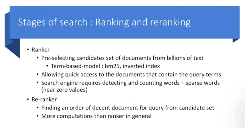 단순히 ranking만 하기에는 한계가 있습니다. 한 번 더 re-ranking 해주는 과정을 거칩니다 retrieval가 re-ranking을 해주는데 결과적으로는 indexing을 해 주는데 좀 더 ordering을 내려줍니다. 가장 그럴싸한 document를 한 번 더 candidate를 뽑은 다음에 다시 순서대로 매겨서 좀 더 적합한 결과를 잘 찾을 수 있게 해주는 Ranker라고 단순히 ranking 해주는 것보다 Re-ranker가 computation cost가 훨씬 더 큰 차이점이 있습니다.