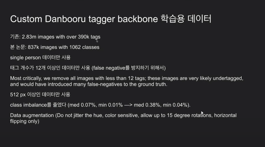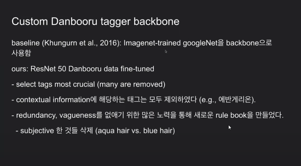 그리고 베이스라인 같은 경우는 Imagenet trained googleNet을 백본으로 그대로 활용했다고 언급하고 있는데, 이 논문에서는 그것이 아니라, ResNet을 Danbooru 데이터로 학습을 시켜서 파인 튜닝을 합니다. 그 과정에서 태그가 굉장히 많이 존재하는데 이것을 예측하는 모델을 또 추가적으로 파인튜닝 학습을 하게 됩니다. Danbooru 데이터 같은 경우는 태그가 굉장히 많이 존재하는데, 그 태그를 상당 부분 줄이는 노력을 하게 됩니다. 특히 contextual 인포메이션에 해당하는 태그, 예를 들면 애니메이션 에반게리온이라고 하면, 에반게리온에 나오는 캐릭터 이름 같은 것들이 디테일한 수준으로 태그로 들어갑니다. 이러한 부분은 contextual 정보이기 때문에 기계가 이해할 수 없다라고 생각을 해서, 모두 제거를 하게 되고, 또 주관적이나 중복 있는 태그 같은 경우도 재건을 해서 새로운 rule book을 제시하게 됩니다.