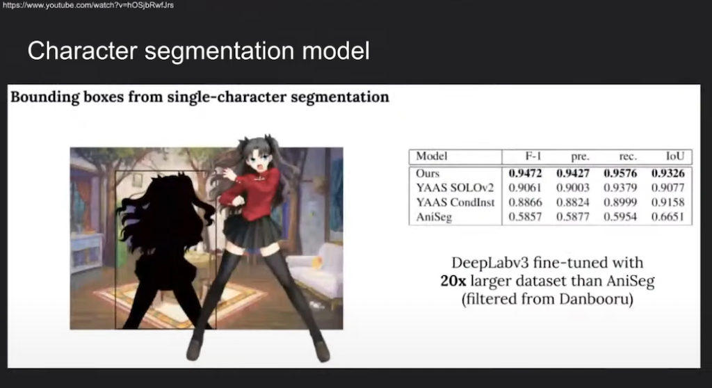 Segmentation이 잘 이뤄지고 난 다음에, 그 Segmentation 결과로부터 boundingbox를 도출해 내는 방식을 취하고 있습니다. 이 데이터셋을 제작하기 위해서 레이블이 필요합니다. 이 논문에서는 레이블을 만들어 내기 위해서 좀 흥미로운 방식을 제시하고 있습니다. 위 그림 중 처음에 앞에 보이는 캐릭터와 그리고 뒤에 보이는 배경을 합성을 하게 됩니다. 앞에 보이는 캐릭터의 경우 Danbooru 데이터라고 해서, 애니메이션이나 illustration 도메인에서 많이 사용되는 데이터이고, 여기서 transparent background tag라고 되어 있는 배경이 없는 데이터만 추리게 됩니다. 그다음에 마찬가지로 Danbooru 데이터 안에서 존재하는 배경 데이터를 골라내서 이 두 가지를 합성해 내는 방식으로 데이터를 만들어주게 됩니다. 특히 전경 같은 경우는 그러면 segmentation에 대한 정보가 있게 되어서, 이것을 합성해서, 앞에서 언급한 DeepLabv3을 이용해, 이 부분에 대한 boundingbox를 추출해 낼 수 있도록 학습하고 있습니다.