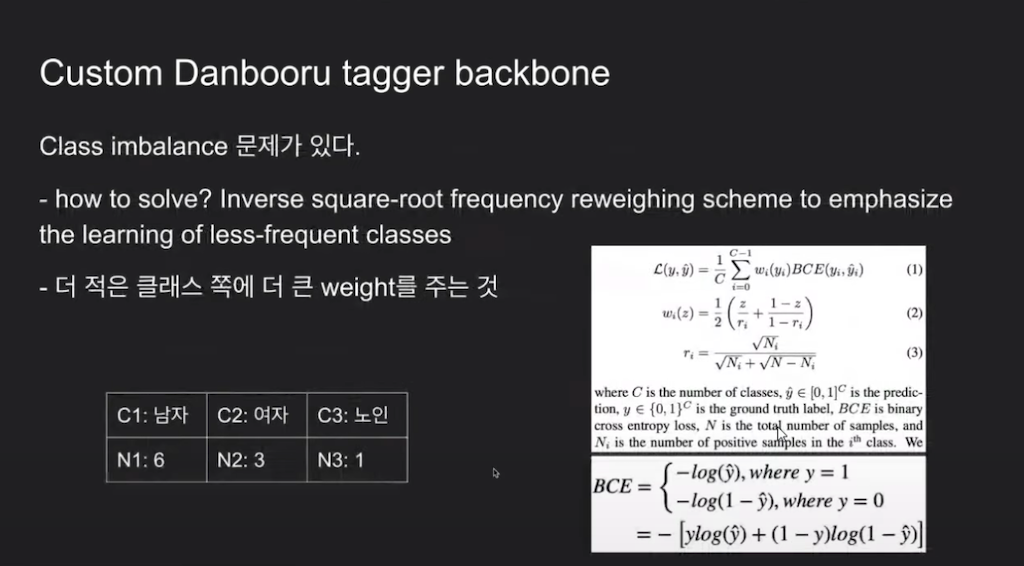 또한 클래스 imbalance 문제가 있다고 이 논문에서는 이야기하고 있습니다. Danbooru 태그 같은 경우는 long tail distribution은 따로 있기 때문에 굉장히 소수의 태그들 그리고 많은 태그들이 굉장히 frequency가 낮은 형태를 보이고 있습니다. 이런 부분은 모델에서 예측을 할 때 낮은 퍼포먼스를 보여주고 있어서 이 부분을 보완하고자 reweighing scheme을 제공을 해서 weight를 조금 다르게 주게 됩니다.