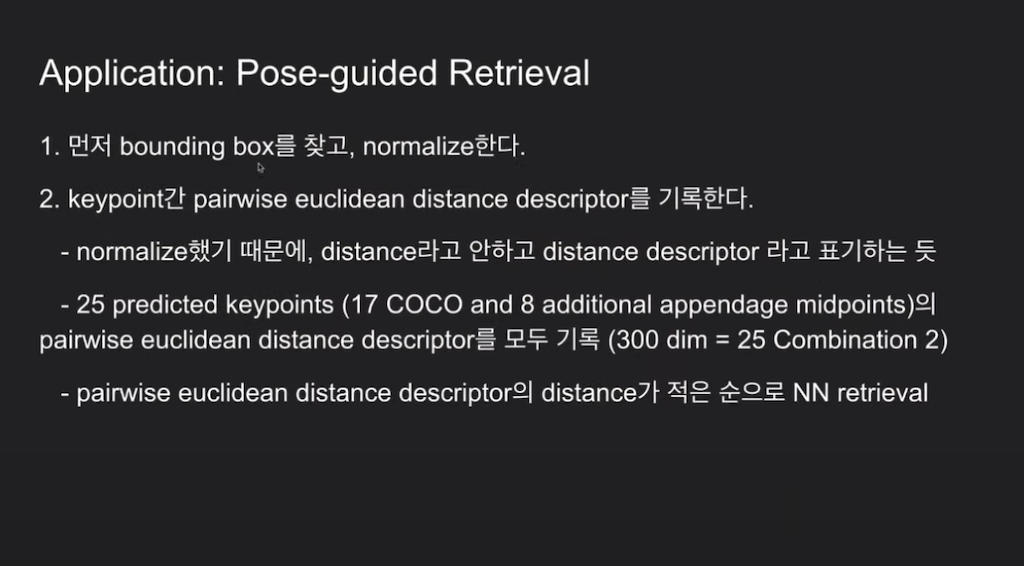 pose-guided retrival의 방법으로, 처음에 boundingbox를 찾고 normalize를 하게 됩니다. 그다음에 존재하는 모든 키포인트 간에 pairwise euclidean distance을 기록 합니다. 그 distance를 모든 경우의 수에 대해서 다 sum을 해서, 그 다음 그 distance가 작은 순으로 retrieval을 하게 되면 Nearest neighbor를 찾을 수 있습니다.
