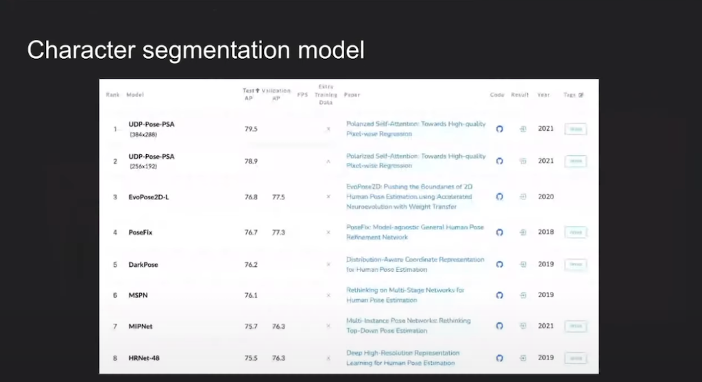 실제로 sota 모델들을 보았을 때, 탑다운 모델들을 지향하고 있는 것을 알 수 있습니다. 대표적으로 위 그림 중 8번 에서 보이는 HRNet이 대표적인 예시입니다. 이것이 다른 sota 모델들에 back bone으로 활용되는 것을 확인할 수 있어서, 대부분이 이런 방식을 취하신다고 보면 될 것 같습니다. 다만, 아쉬운 점은 이 논문에서 지향하는 것은 하나의 캐릭터에 대해서 진행하는 것이기 때문에 표면적으로는 탑다운을 지향하고 있지만, 애초에 트레이닝을 하는 시점에서 인풋 데이터를 boundingbox를 맞춰서 넣는 부분이 있어서, 완벽하게 탑다운 방식이라고 말씀드리기는 좀 어려운 점이 있을 것 같습니다.