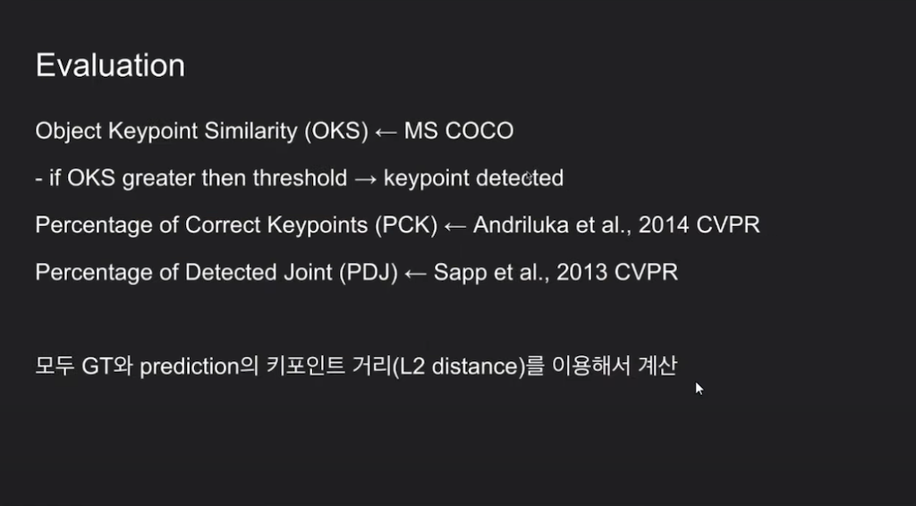 마지막으로 Evaluation 부분에 대해 설명드리겠습니다. 활용하는 매트릭은 기존에 많이 활용되고 있는 OKS 매트릭이나 PCK, PDJ 같은 매트릭도 활용을 하고 있는데, 모두 조금씩 다르긴 하지만, groud truth와 prediction key point 거리를 기반으로 계산을 하는 특징이 있습니다.