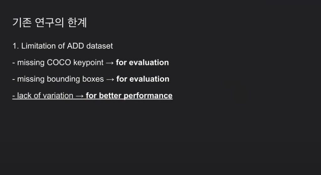 예를 들어서 기존 베이스라인 같은 경우는 정면을 보고, 앞으로 똑바로 서있는 데이터만 존재했다고 했을 때, 이 논문에서 말하는 바는, 앞으로 누워 있거나 옆으로 돌아 있거나 앉아 있거나 하는 다양한 어려운 포즈에 대해서도 추가적으로 2000장 이상의 하드 샘플을 추가했습니다.