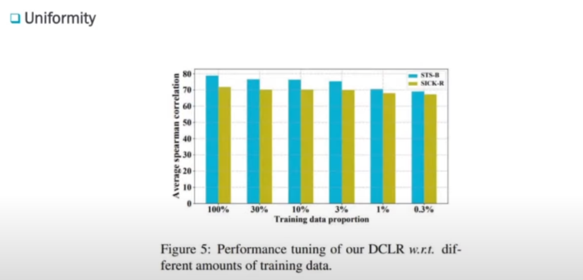 그리고 sentence representation에서 중요한 정량적 지표 중 하나가 Uniformity입니다. 이 Uniformity도 DCLR을 활용했을 때 훨씬 작은 Loss를 갖고 있음을 보여주고 있습니다. 주황색이 SimCSE이고, 이 SimCSE에다가 DCLR를 적용했을 때 Uniformity가 훨씬 좋아지는 것을 볼 수 있습니다.