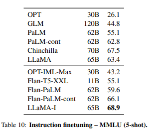 위 표에서, 우리의 instruct 모델 LLaMA-I의 MMLU 결과를 보고, OPT-IML (Iyer et al., 2022) 및 Flan-PaLM 시리즈 (Chung et al., 2022)와 같은 중간 크기의 기존 instruct finetuned 모델과 비교한 결과입니다.