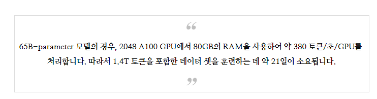 65B-parameter 모델의 경우, 2048 A100 GPU에서 80GB의 RAM을 사용하여 약 380 토큰/초/GPU를 처리합니다. 따라서 1.4T 토큰을 포함한 데이터 셋을 훈련하는 데 약 21일이 소요됩니다.