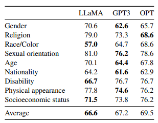 높을수록 해당 부분에 대한 내용을 포함한다는 내용이고 LLMA는 평균적으로 다른 언어 모델에 비해 그런 부분을 덜 생산하는 걸 확인할 수 있습니다.