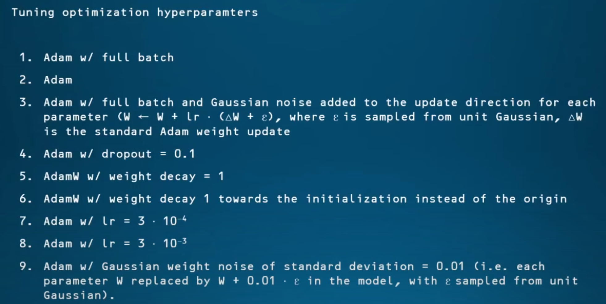 위 그림은 hyperparameters 튜닝에 대한 설명인데, 특이한 점으로 흔히 사용하고 있는 Adam Optimizer의 아홉 가지 변형을 이용해서 각각의 모델이 어떻게 iteration을 진행하는지를 확인하였습니다.
