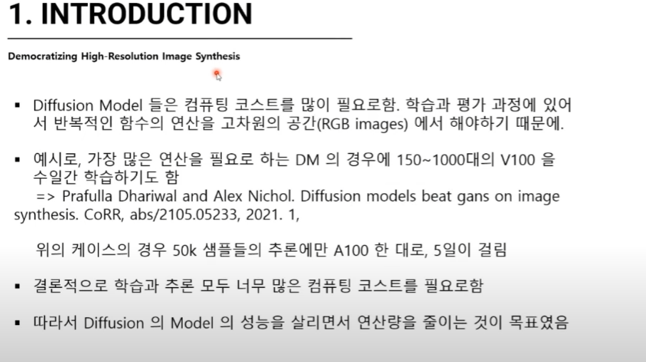 Diffusion 모델들이 컴퓨팅 코스트를 많이 필요로 해서 그러한 것들을 개선하는데 포인트를 맞췄습니다. 예를 들어서 가장 많은 연산을 필요로 하는 Diffusion 모델들 중에 하나를 골라보면 거의 몇백대의 V100을 이용해서 수일간 학습시켜야 되는 케이스도 있고 이 케이스 같은 경우에는 50000개의 샘플들을 A100으로 추론해도 5일씩 걸리는 학습과 추론에 너무 많은 컴퓨팅 코스트를 필요로 하는 단점들이 존재를 했습니다.