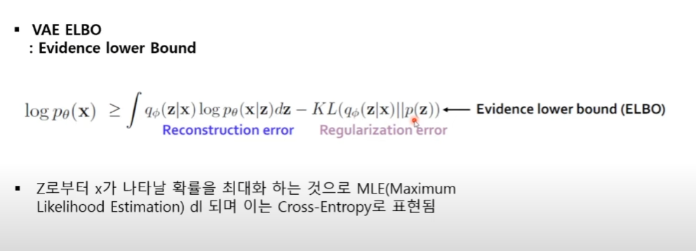 다시 말해서 최종적인 VAE 로스 같은 경우 objective function 같은 경우에는 Z를 베이스로 했을 때 X를 만들어내는 함수를 유도해 내는 것이 그 목표라고 할 수가 있습니다. 따라서 Z로부터 X가 나타날 확률을 최대화하는 것으로 Maximum Likelihood Estimation을 하게 되면서 이를 cross entropy와 같은 방식으로 표현을 하게 됩니다.