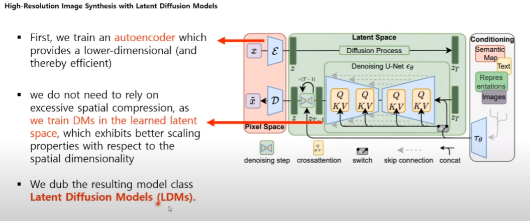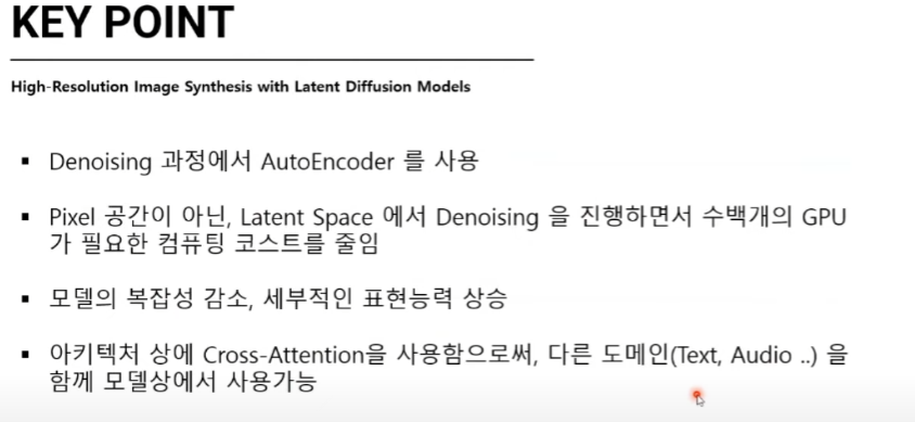 Denosing 과정에서 Auto Encoder를 사용을 하게 되고 pixel 공간이 아닌 latent space에서 Denosing을 진행하면서 엄청난 양의 GPU나 computing cost가 들어갔던 포인트들을 개선을 시켰고, 모델의 복잡성들을 감소시켰고 cross attention을 사용함으로써 다른 도메인의 모델들을 함께 사용 가능하게 된 점이 있습니다.