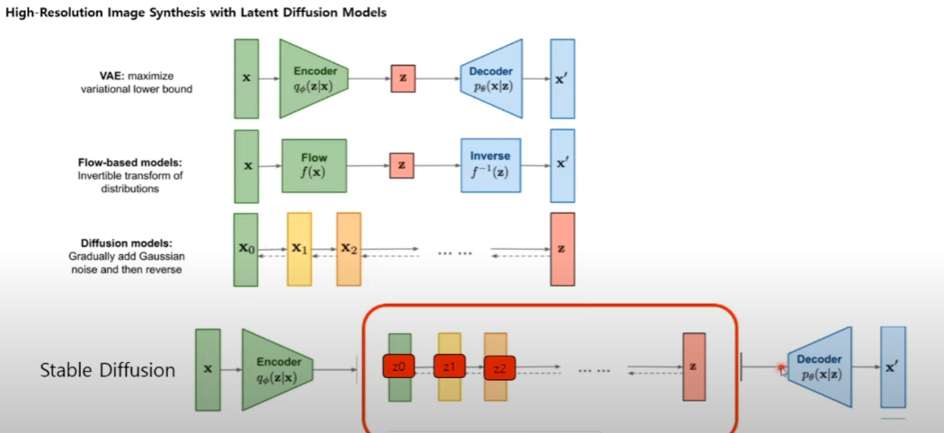 다시 말해서 VAE의 Auto Encoder noise 과정과 Diffusion 모델의 noise 과정을 섞은 아키텍처를 가지고 있습니다. 지금 보시는 바와 같이 X Input값에서 Encoder를 해서 latent variable를 만들어내는 것까지는 Auto Encoder의 과정과 유사하다고 할 수 있습니다. latent vector상에서 모델이 했던 대로 forward process를 통해 가지고 noise들을 주입을 하게 됐습니다. 그 주입을 다시 decoder로 풀어내는 과정은 Auto Encoder와 동일합니다.