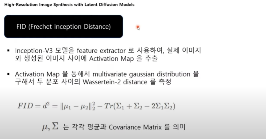 앞에서 말씀드린 평가 매트릭인 FID 같은 경우에는 Inception V3 모델을 feature extractor를 사용을 해서 실제 이미지와 생성된 이미지 사이에서 Activation Map들을 모두 추출해 냈습니다. 이 추출해 내는 전체 Activation Map에 대해서 분포를 만들게 되고 이 분포를 Wassertein-2 distance를 이용을 해서 추정을 한 값이라고 합니다.