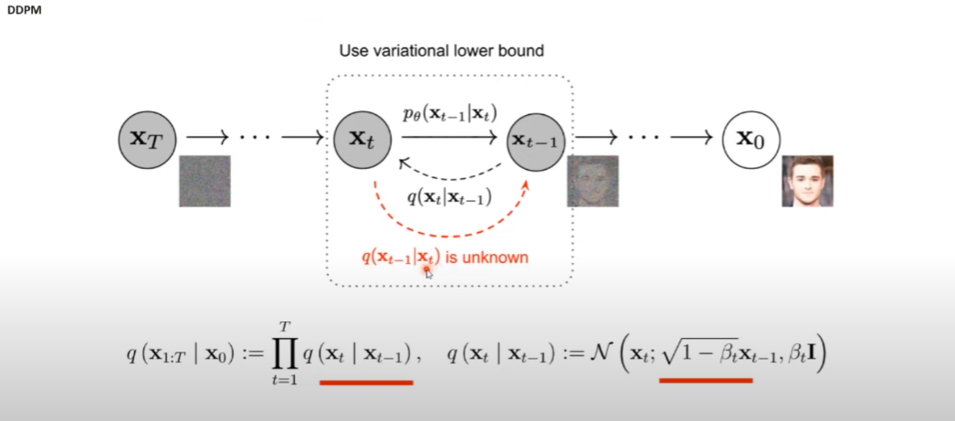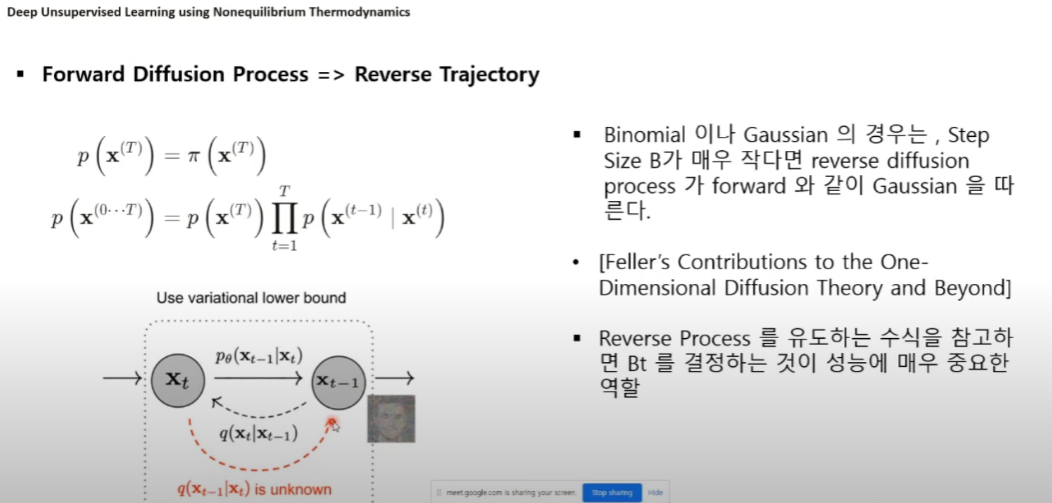 보시는 그림 같은 경우에는 앞이 noise 이미지고 이 noise 이미지에서 다시 원본 이미지를 만들어내는 함수를 추론해 내는 것이 목표라고 할 수가 있습니다. 따라서 여기서는 파라미터로 β가 주어지면 됩니다. 이 β같은 경우에는 다시 말해서 noise를 주입하는 스텝이 매우 작다면 그 reverse function 또한 비슷한 분포를 따를 수 있다는 전제를 깔고 가는 게 됩니다. 따라서 이러한 전제를 깔고 가게 되면이 β t를 결정하는 것이 reverse process를 얼마나 잘 추론해 낼 수 있느냐에 대해서 중요한 역할을 한다라고 합니다.