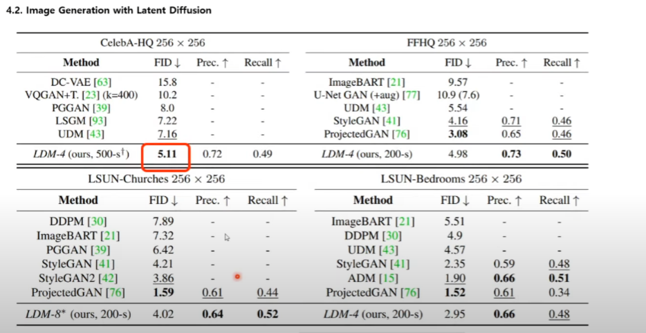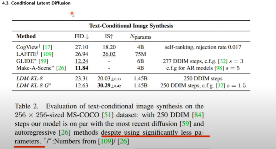 Text to 이미지 합성에 대해서는 지금 FID상으로도 지금 latent 모델이 괜찮은 스코어를 보여주고 있는데 여기서 말하는 포인트는 결국 파라미터 개수입니다. 거의 40억 개에 달하는, 60억 개에 달하는 파라미터들을 10억 개로 줄였다는 것이 그 포인트라고 할 수 있습니다.