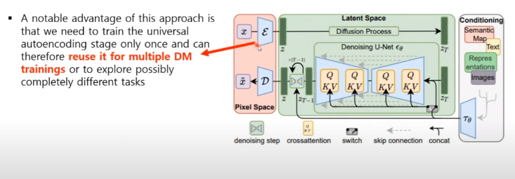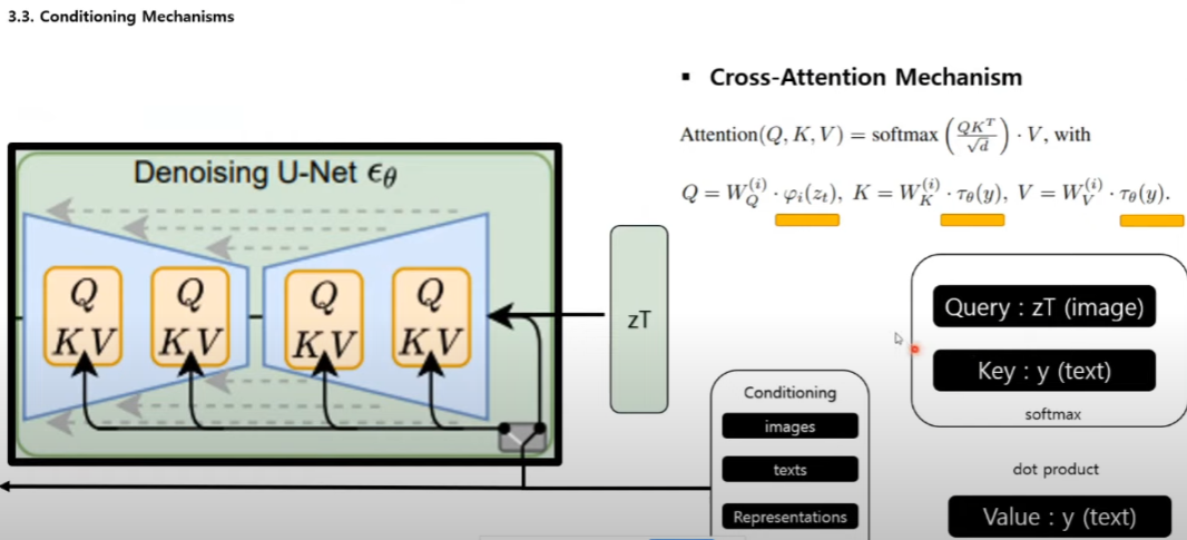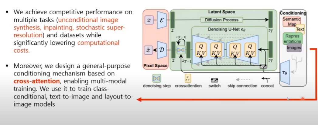이러한 전체적인 아키텍처를 가지고 생성 모델의 역할을 해야 되는 것을 볼 수가 있습니다. 그래서 보시는 Conditioning 같은 경우에는 예를 들어서 텍스트나 이미지나 다른 도메인의 데이터들이 들어왔을 때 데이터들을 각각의 스텝에서 attention 메커니즘을 통해서 학습을 하게 됩니다.