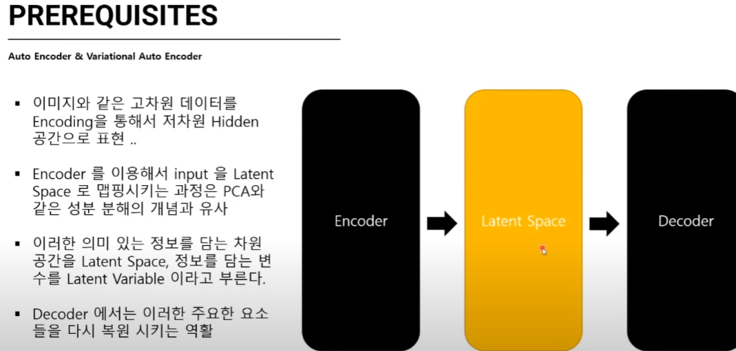 VAE 같은 경우에는 이미지와 같은 고차원 데이터를 encoding을 통해서 저 차원 space로 맵핑을 시킨 다음에 그것들을 다시 decoder를 이용해서 생성을 시켜내는 구조라고 할 수 있습니다. Encoder를 이용해서 이미지에 고차원을 저 차원으로 줄이는 개념은 사실상 주성분 분석과 같은 PCA와 같은 성분 분해의 개념과 굉장히 유사하다고 볼 수가 있습니다. 따라서 이러한 의미 정보 담는 차원의 공간을 latent space에 들어가는 변수들을 latent variable이라고 부르게 됐습니다.