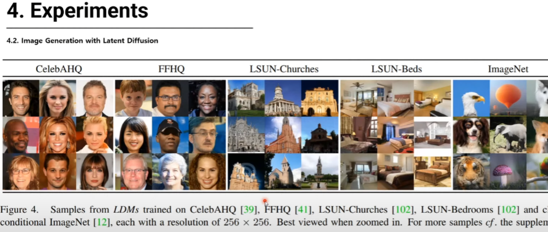 논문에서는 Auto Encoder를 먼저 학습을 시키게 되고 Auto Encoder를 학습을 시키고 process를 쭉 하면서 Auto Encoder 외에 스텝마다 UNet 아키텍처를 또 학습을 시키게 되는 구조라고 보시면 됩니다. 따라서 이런 모델들을 latent Diffusion 모델, 다시 말해서 latent 공간에서 학습을 진행하는 Diffusion 모델이라고 정의를 하겠다고 밝히고 있습니다.