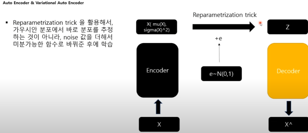 사용을 할 때 정규 분포 방식을 이용해서 z를 샘플링하는 것이 아니라 샘플링하는 과정에서 noise를 더해줘서 미분 가능한 함수를 바꿔준 후에 그 함수를 학습시키는 방식으로 유도를 해냈습니다.