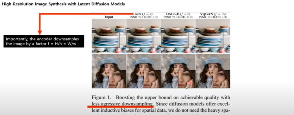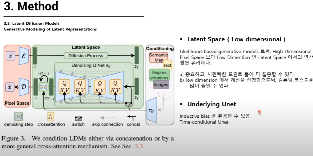 논문에서 키포인트로 잡았던 latent space로 옮겨서 연산을 한다라는 포인트는 결국은 pixel space 보다 low dimension 한 space의 영상이 컴퓨팅 코스트를 줄이는데 훨씬 유리하다는 점이랑 모델의 추론능력 상으로 봐서 Semantic 한 포인트들에 좀 더 집중할 수 있다는 것을 내세웠습니다. UNet을 사용한 것은 UNet 구조가 제공하는 inductive bias를 사용할 수 있기 때문에 UNet을 사용했다고 밝히고 있습니다.