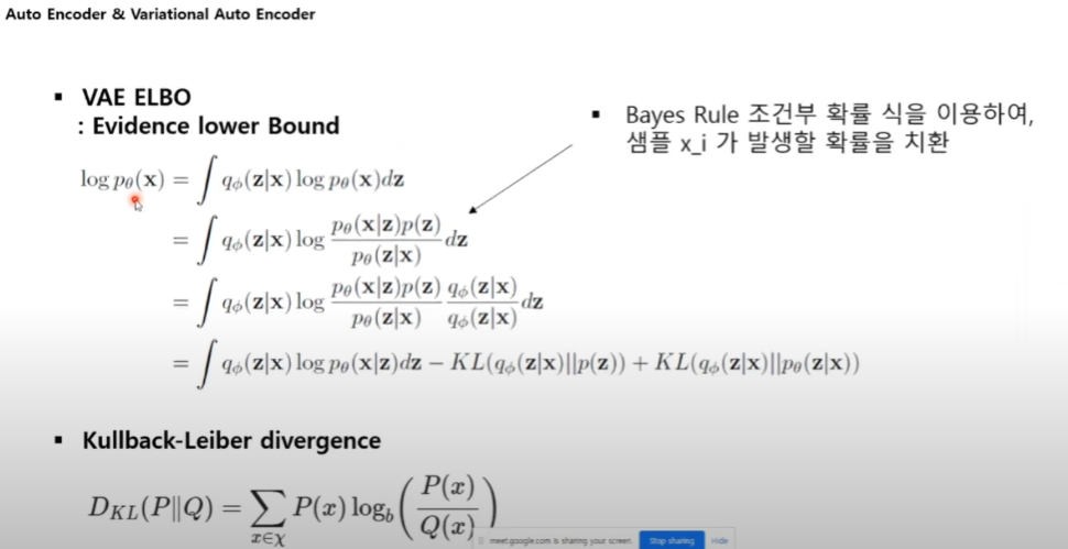 오른쪽에 있는 KL divergence 공식 같은 경우에는 latent space를 만들 때 함수를 이미 알고 있고 그리고 X에서 Z를 만들 함수를 알고 있으므로 두 함수의 분포차는 최소한의 바운드가 되는 lower bound가 되겠습니다.