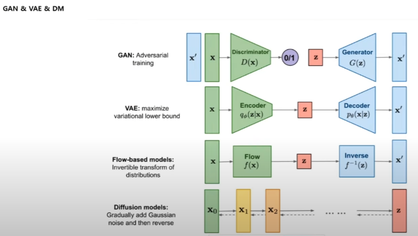 해당 그림에서는 생성 모델로 유명한 GAN과 Auto Encoder 그리고 Diffusion 모델의 전체적인 아키텍처를 정리해 놓은 표입니다.