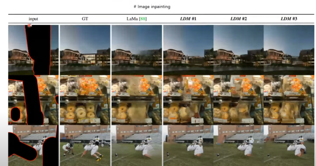 inpainting 같은 경우에는 이미지를 가렸을 때 다시 복원시키는 super resolution task에 적용을 시켰고 computational cost를 많이 낮추었다고 표현을 하고 있고 다른 도메인의 embedding들에 대해서 noise 이미지와 함께 cross attention을 사용을 하였다고 합니다.