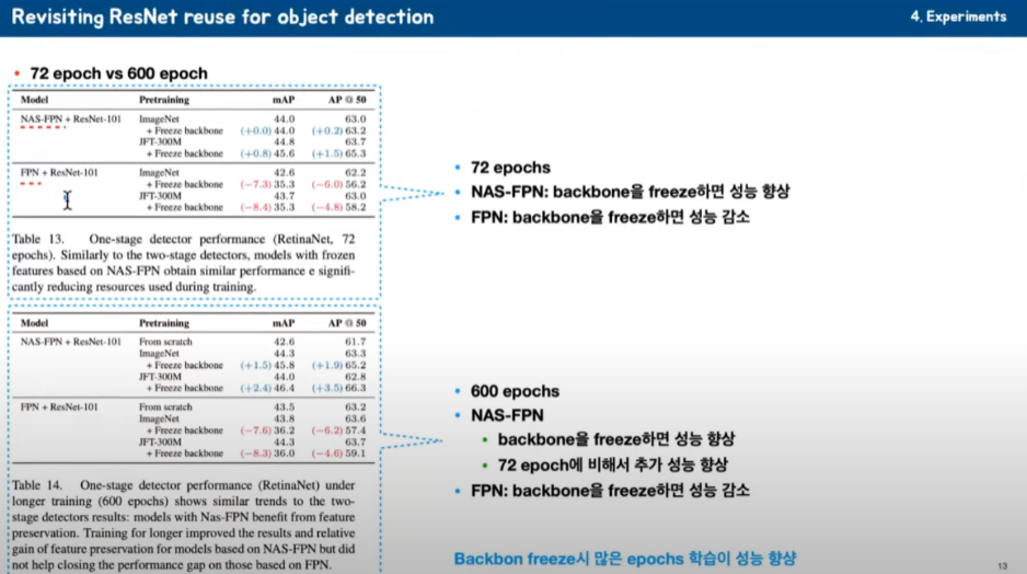 72 epoch 보다는 600 epoch을 학습했을 때는 FPN은 성능이 떨어지고 있는데 NAS-FPN는 성능이 올라오고 있습니다. 올라오고 있는데 72 epoch 보다는 600 epoch이 성능이 더 많이 올라가는 걸 볼 수 있습니다. 그리고 freeze 했기 때문에