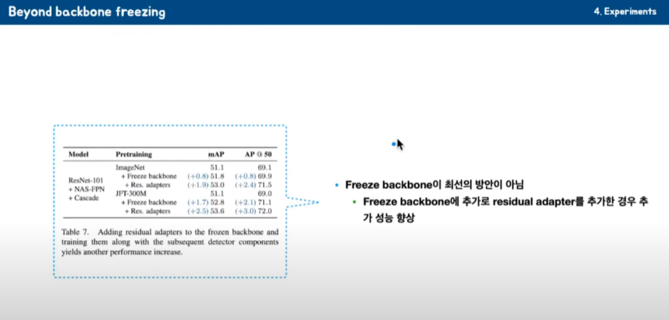 backbone freeze가 최선의 방법이냐라고 얘기하고 있는데 그렇진 않고 이렇게 freeze를 한 다음에 residual adapter를 추가적으로 더 넣었을 경우에 성능향상이 있다고 얘기하고 있습니다.