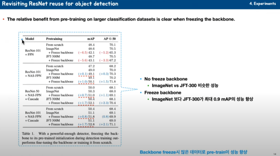 보시면 FPN, NAS-FPN 그다음에 Cascade, ResNet 키워가면서 비교해 봤는데 freeze 하지 않았을 경우에는 ImageNet이나 JFT-300M이 비슷한 성능을 내고 있는 것을 볼 수 있습니다.