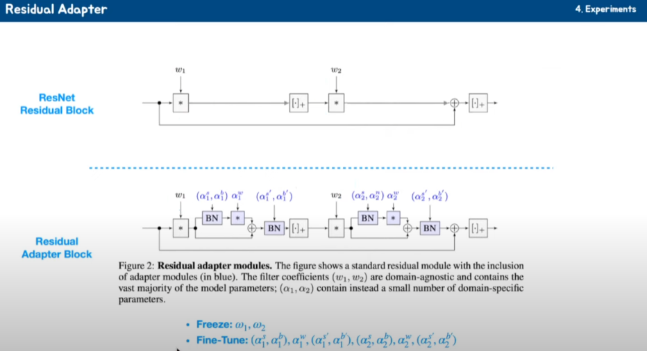 보통 이게 ResNet의 Residual block인데 W가 있고 Activation function이 있어서 이렇게 residual을 구성하게 됩니다. residual adapter는 여러 가지 task를 지원하기 위해서 이렇게 ResNet에다가 추가적으로 이렇게 adapter block들을 추가했습니다. 그러고 나서 w1, w2는 freeze를 하고 추가되는 네트워크들을 Fine-tuning 하도록 하는 게 residual adapter입니다.